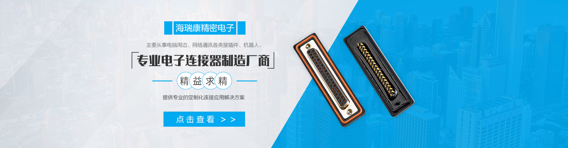 東莞市海瑞康精密電子科技有限公司是一家集產品開發設計、生產、銷售、服務為一體的專業電子連接器、連接線制造廠商.主要從事電腦周邊、網絡通訊各類接插件、機器人、工業自動化、機械儀器、機器視覺、醫藥自動化設備等高精密高規格特種連接器及線纜組合.產品廣泛應用于:工業及電力控制、航天、軍工、電子通訊、安防、LED光電、液晶顯示、變頻器、伺服系統、醫療儀器、汽車電子、電腦主板、電子玩具、各類消費類電子、能源交通等領域.公司致力于為廣大客戶提供專業的定制化連接應用解決方案及多元化的一站式服務......